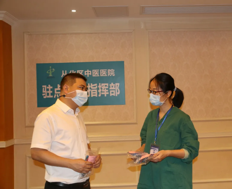 8月19日上午,蔡达副院长带队慰问了我院预检分诊、发热门诊及驻点酒店医务人员,向奋战在抗疫一线的战士带去节日的祝福,并送上我院特制的中药防疫香囊。蔡达副院长对医务人员舍小家顾大家,为守护群众健康作出不懈努力致以崇高敬意,强调要坚持人民至上、生命至上,崇尚医德、钻研医术、秉持医风、勇担重任,努力促进医学进步,为建设健康中国、增进人民健康福祉作出新贡献,同时叮嘱医务人员要保重好身体。医务人员纷纷表示:将不忘初心,全心全意为患者服务!