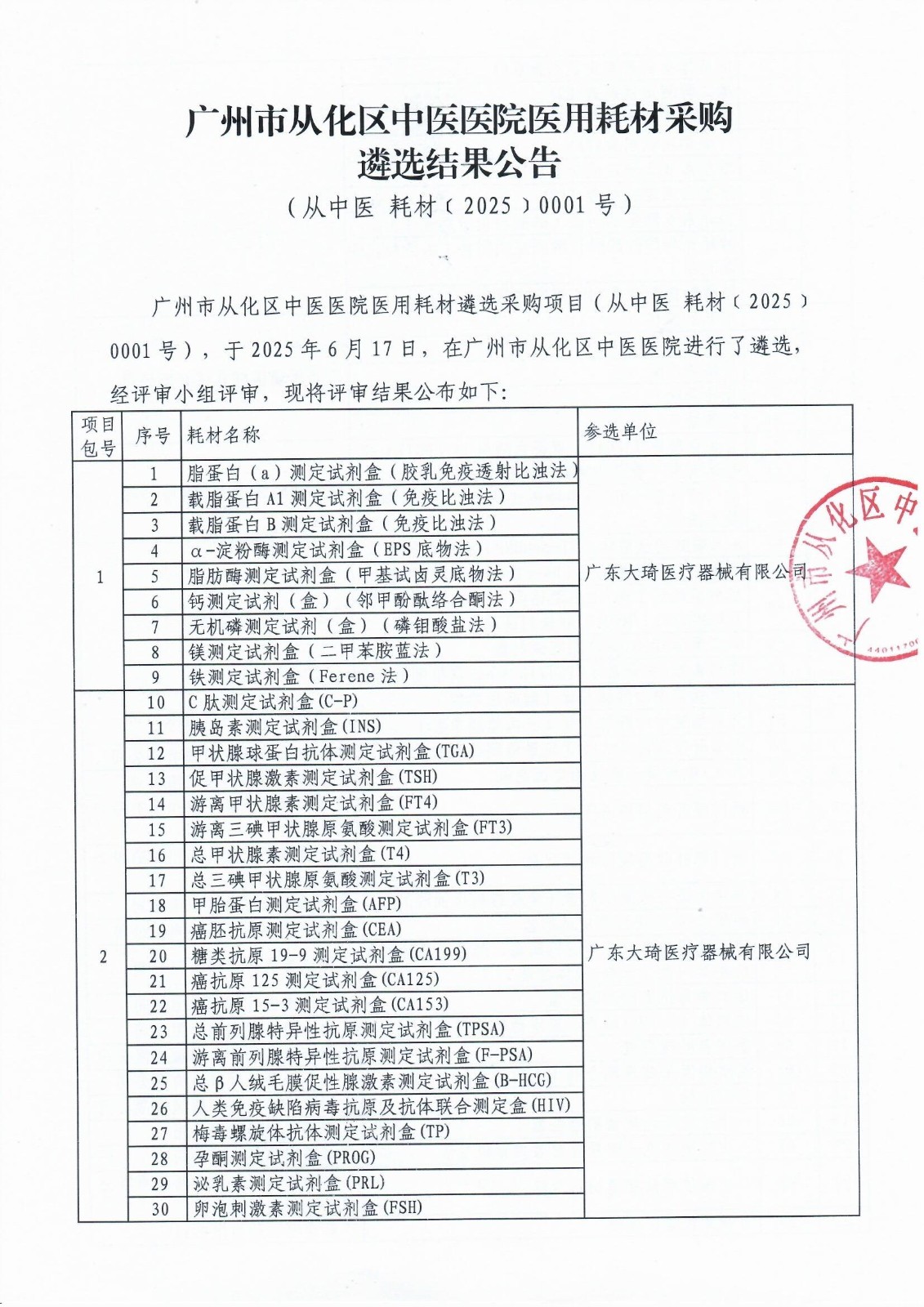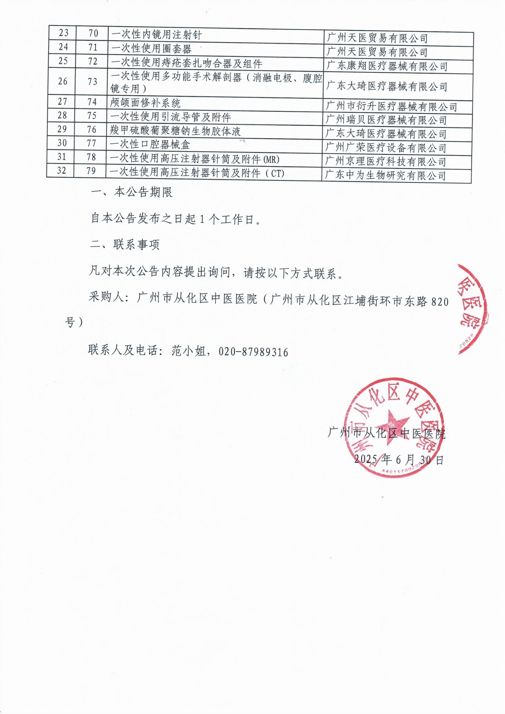 广州市从化区中医医院医用耗材采购遴选结果公告(从中医 耗材﹝2025﹞0001号)