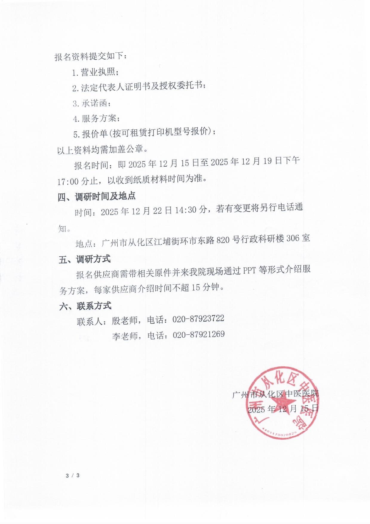 广州市从化区中医医院打印机租赁服务调研公告