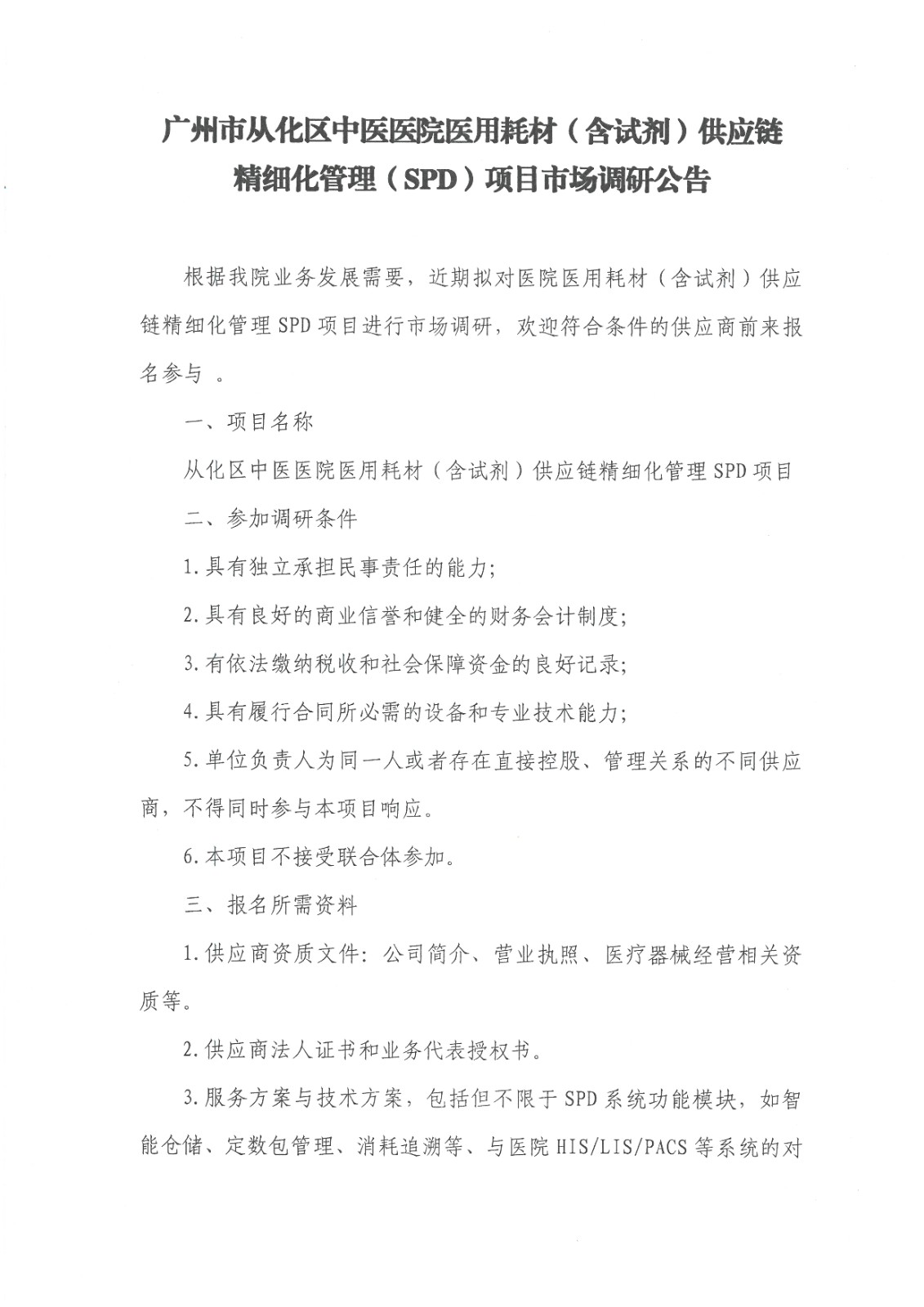 广州市从化区中医医院医用耗材(含试剂)供应链精细化管理(SPD)项目市场调研公告