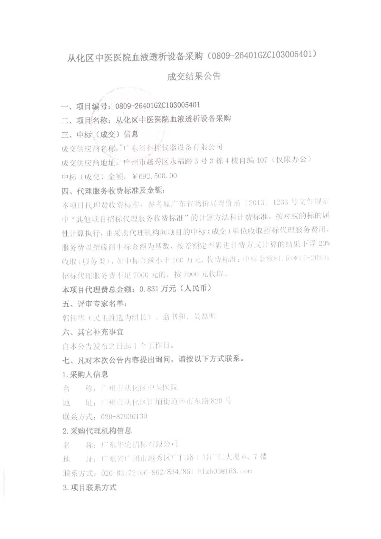 从化区中医医院血液透析设备采购(0809-26401GZC103005401)成交结果公告