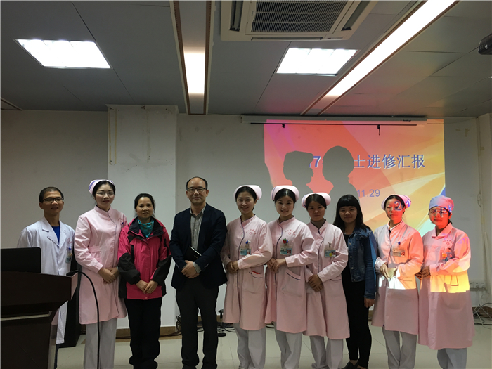 11月29日16:00,护理部在门诊5楼会议室举行2017年护士进修汇报会,2016年下半年及2017年外出进修的6名护士(郭敏华、谢惠贤、江翠明、刘云开、邝诗源、潘剑芸)依次进行汇报,医院林强副院长、护理部袁小燕主任、李莉副主任等出席,非值班护理人员积极到场聆听汇报。