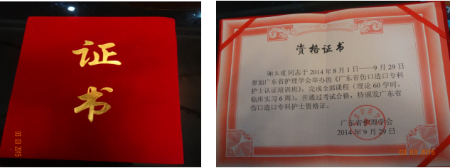②2014年8-9月参加了广东省伤口造口专科护士认证培训班并考取《广东省伤口造口专科护士资格证》。