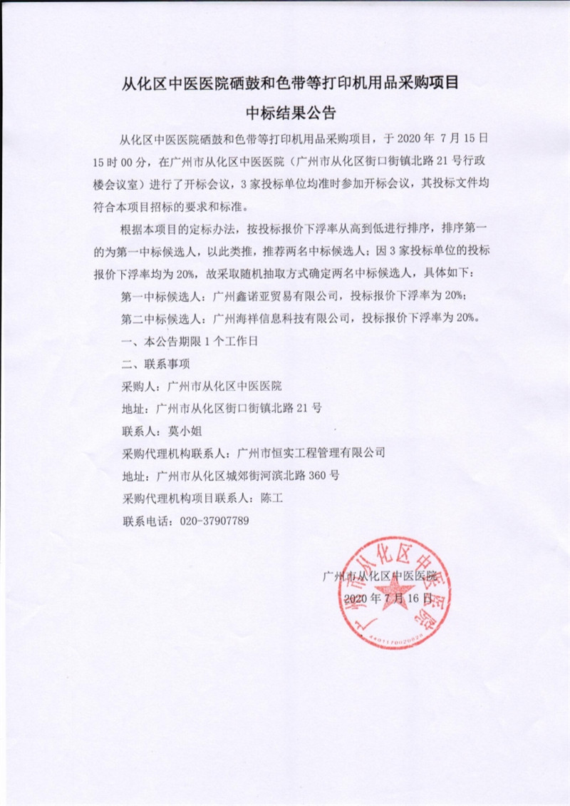从化区中医医院硒鼓和色带等打印机用品采购项目中标结果公告