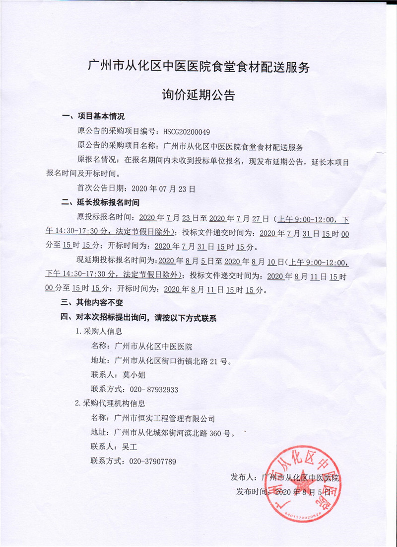 广州市从化区中医医院食堂食材配送服务询价延期公告