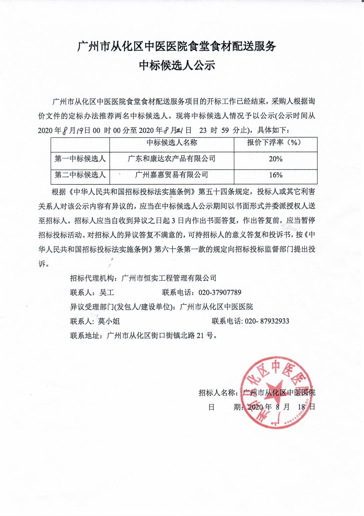 广州市从化区中医医院食堂食材配送服务中标候选人公示