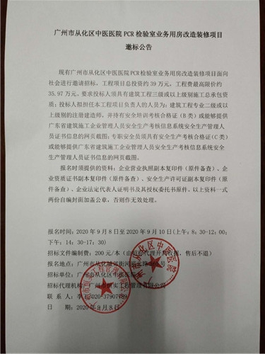 广州市从化区中医医院PCR检验室业务用房改造装修项目邀标公告
