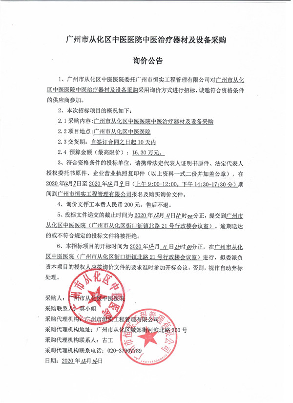 广州市从化区中医医院中医治疗器材及设备采购询价公告