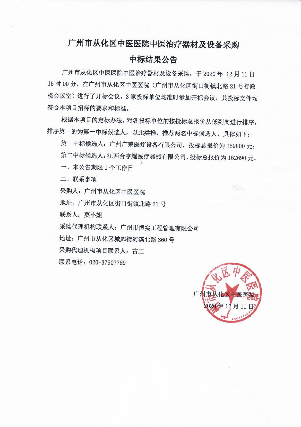 广州市从化区中医医院中医治疗器材及设备采购中标结果公告