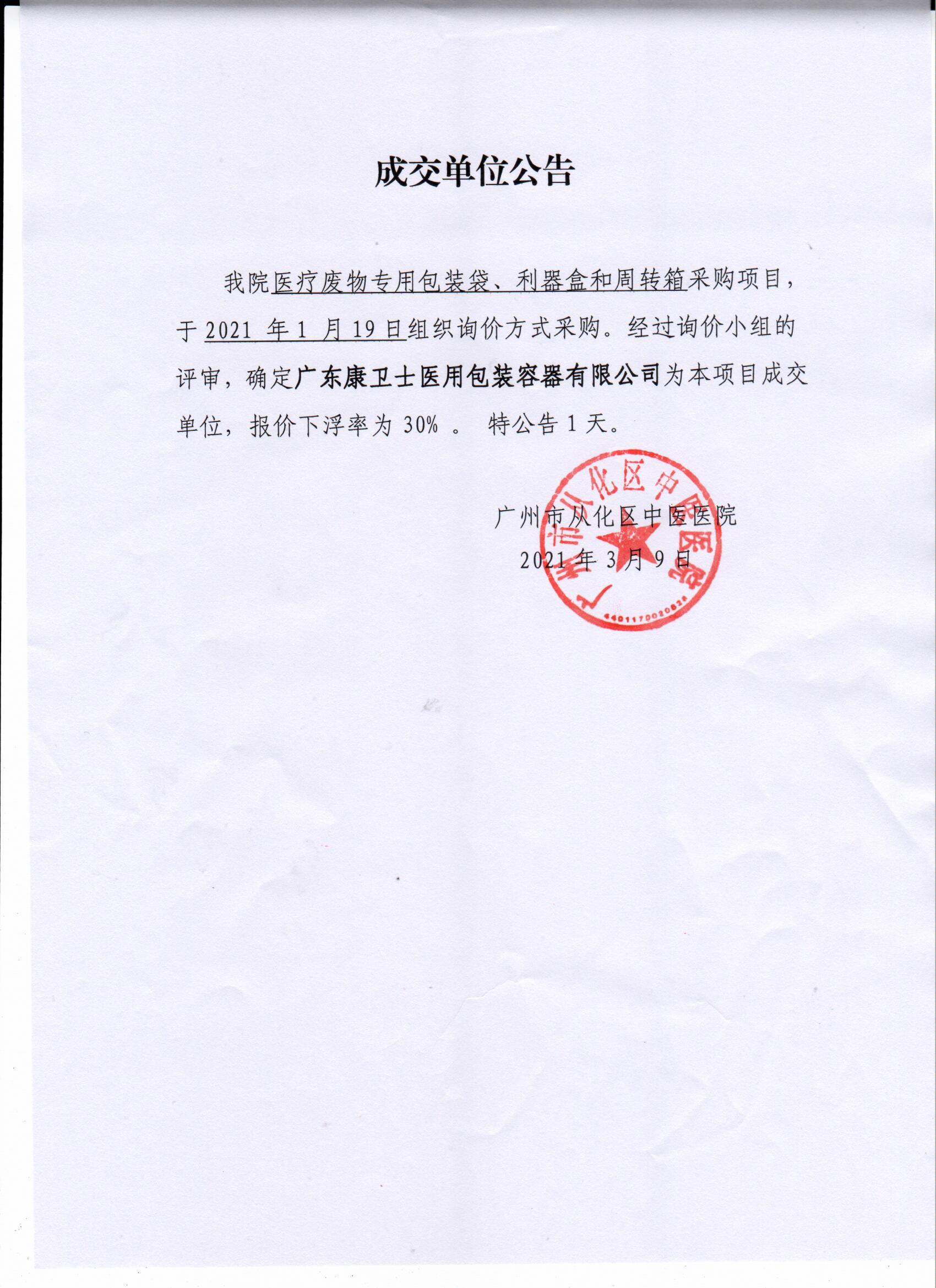 广州市从化区中医医院医疗废物专用包装袋、利器盒和周转箱采购项目成交单位公告