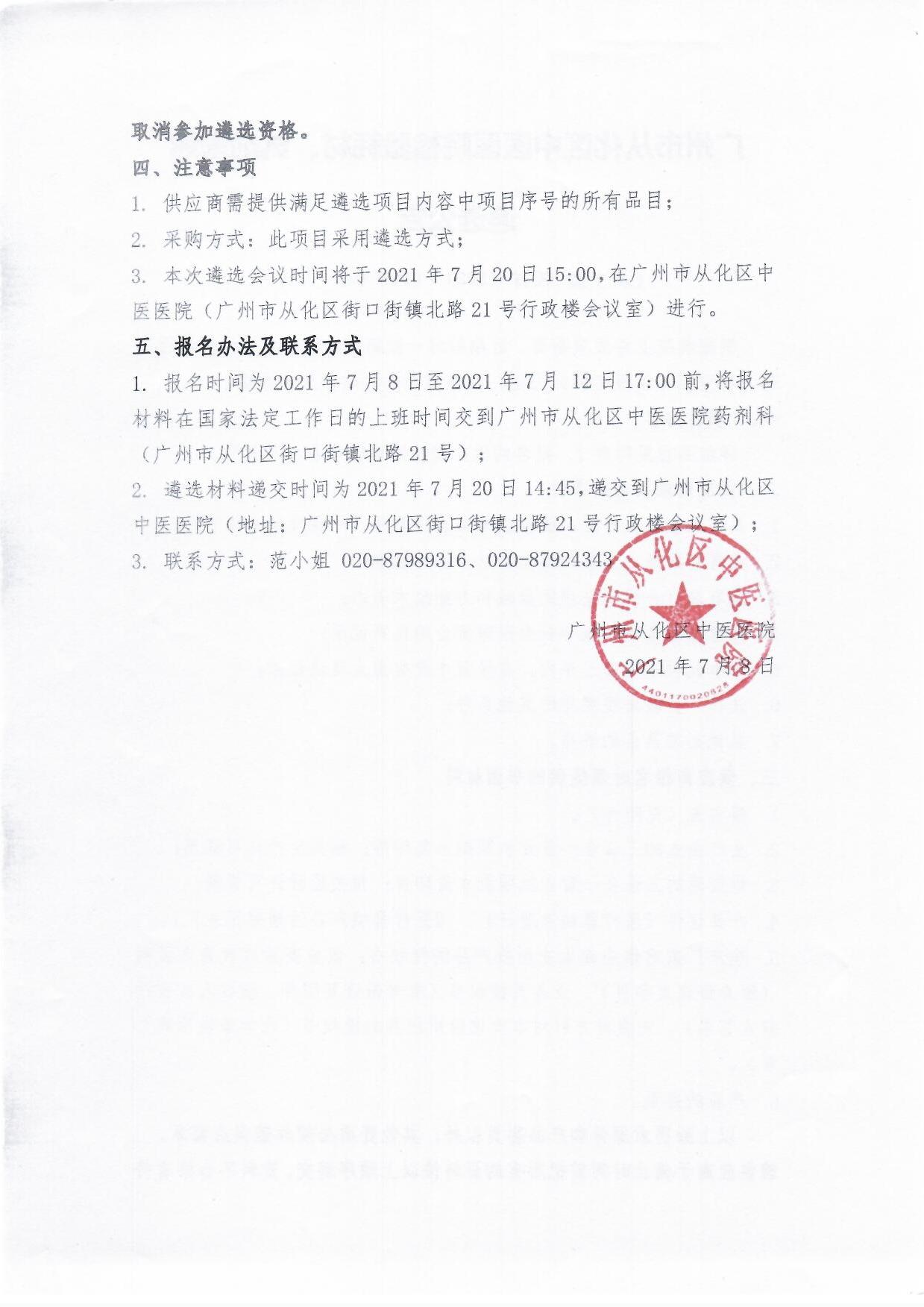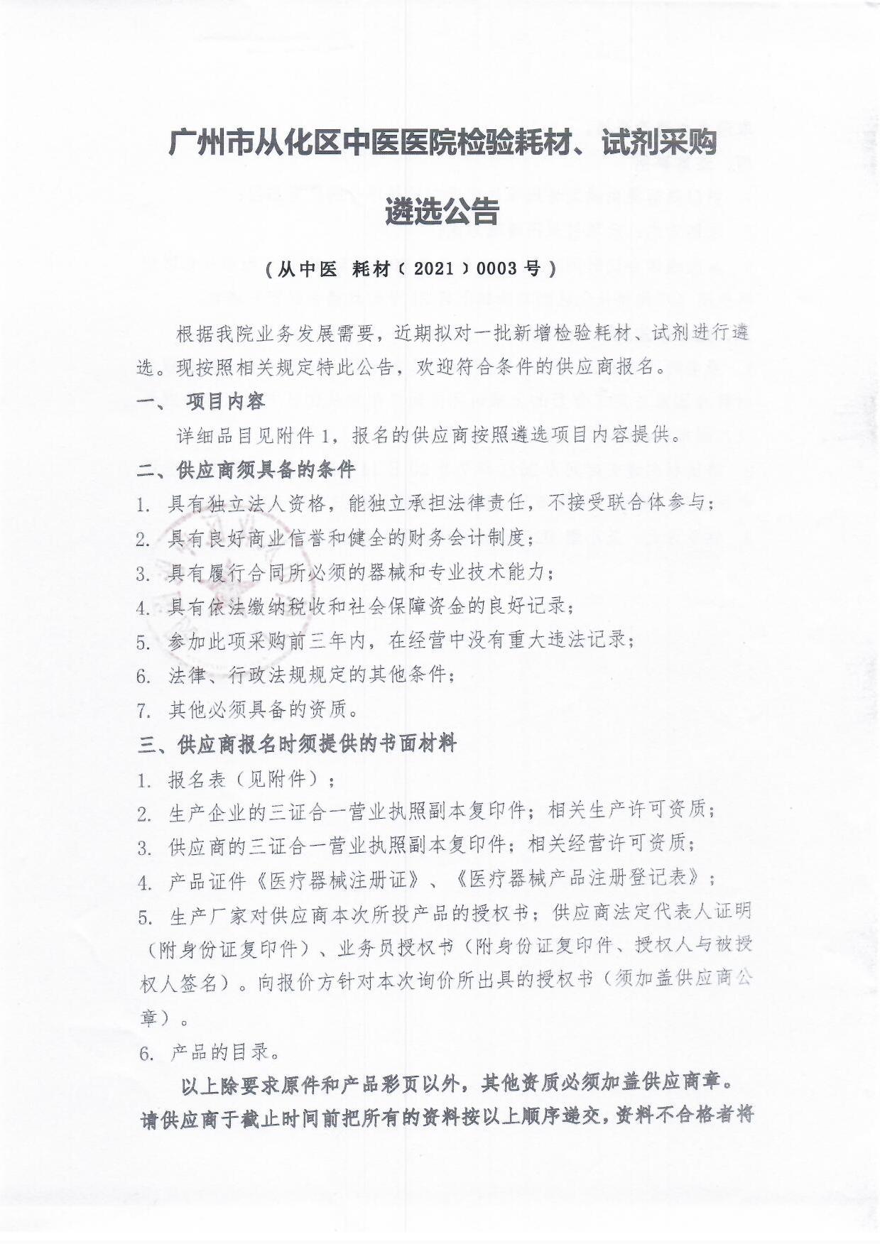 广州市从化区中医医院检验耗材、试剂采购遴选公告