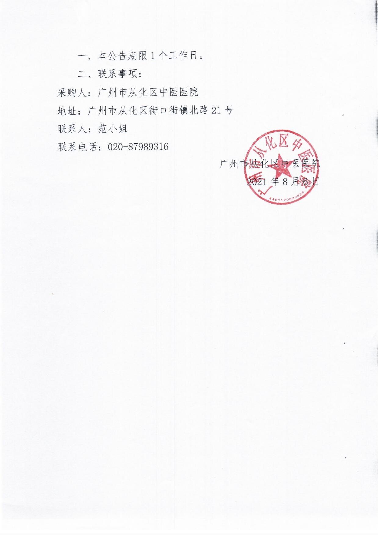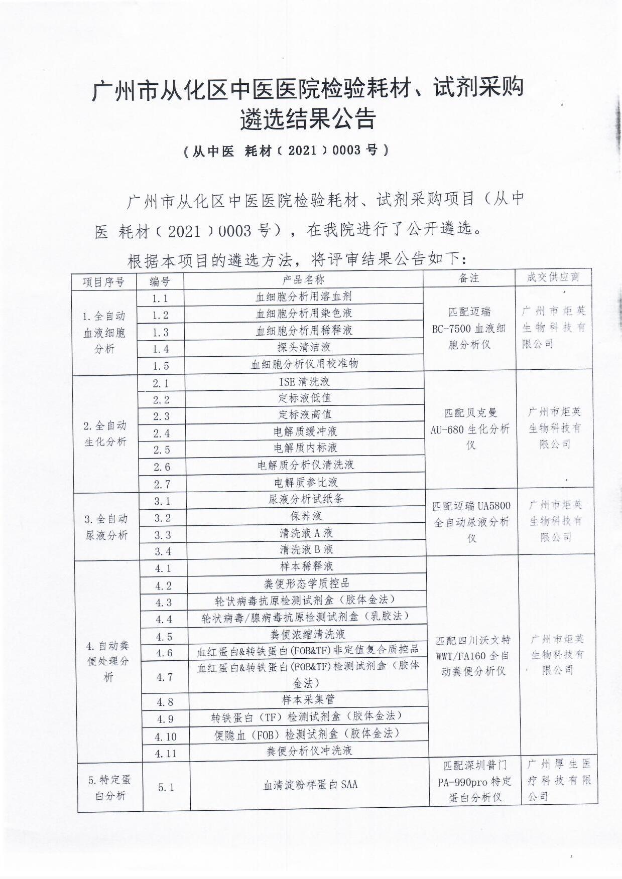 广州市从化区中医医院检验耗材、试剂采购遴选结果公告(从中医 耗材【2021】0003号)