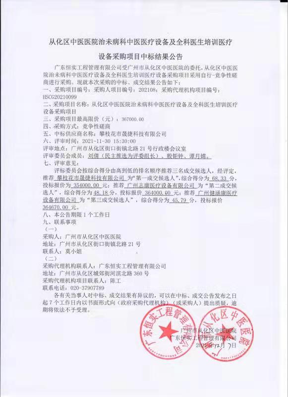 从化区中医医院治未病科中医医疗设备及全科医生培训医疗设备采购项目中标结果公告