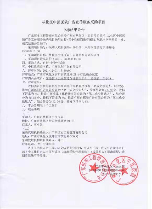 从化区中医医院广告宣传服务采购项目中标结果公告