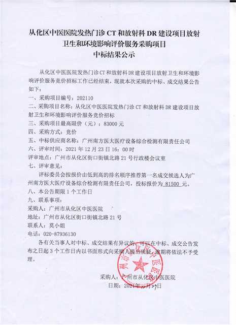 从化区中医医院发热门诊CT和放射科DR建设项目放射卫生和环境卫生影响评价服务采购项目中标结果公示