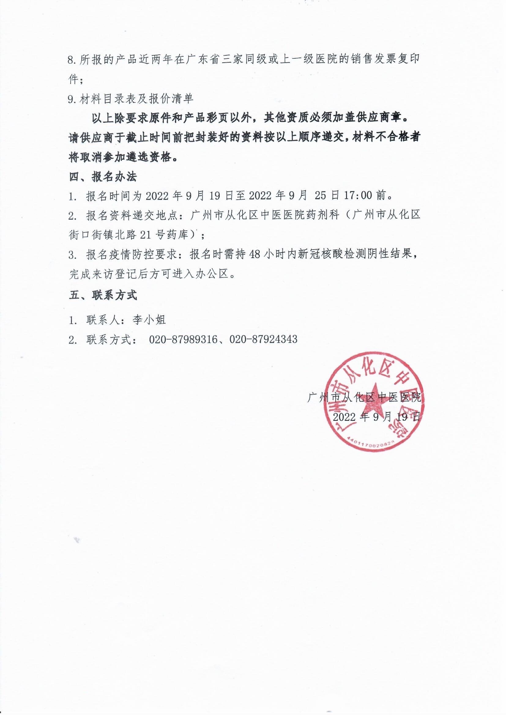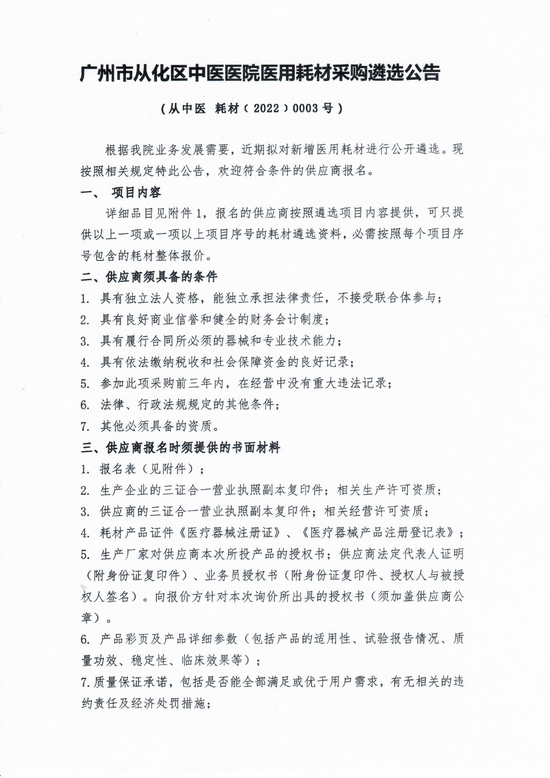 广州市从化区中医医院医用耗材采购遴选公告-从中医 耗材﹝2022﹞0003号