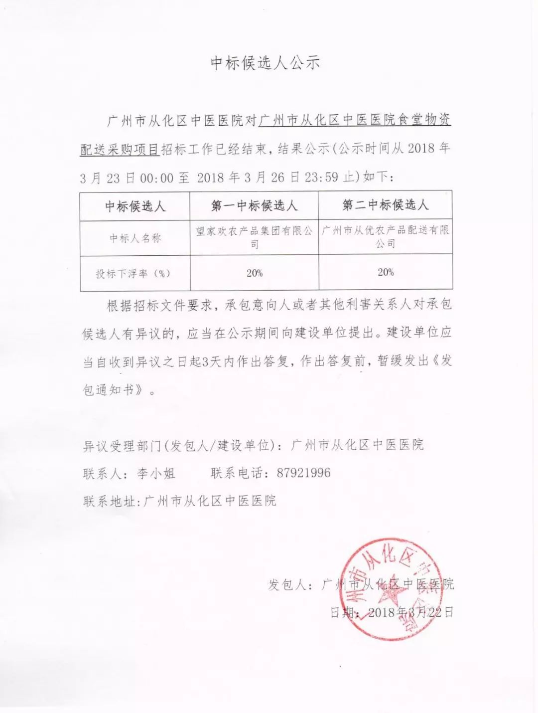 广州市从化区中医医院对广州市从化区中医医院食堂物资配送采购项目招标工作已经结束,结果公示(公示时间从2018年3月23日00:00至 2018年3月26日23:59止)如下: