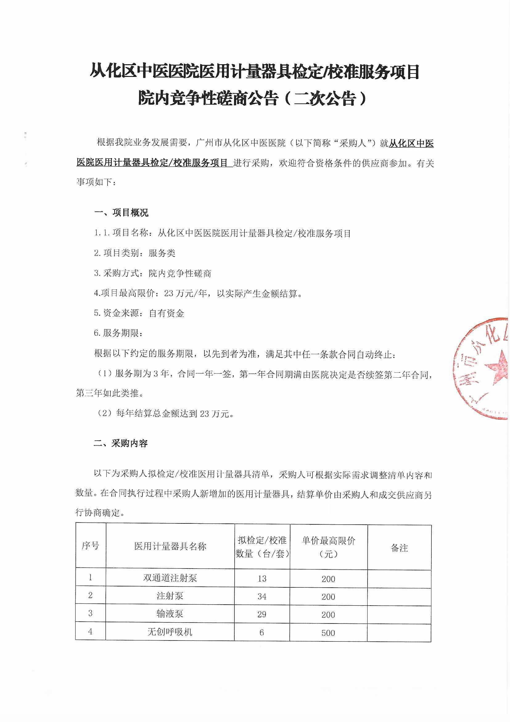 从化区中医医院医用计量器具检定校准服务项目院内竞争性磋商公告(二次公告)