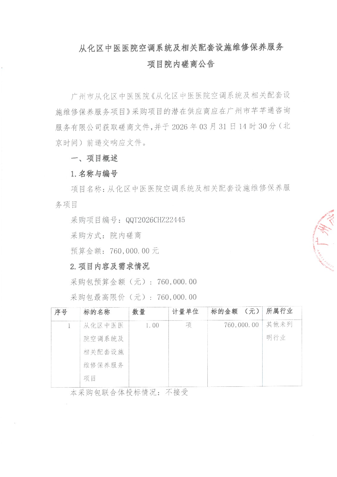 从化区中医医院空调系统及相关配套设施维修保养服务项目院内磋商公告
