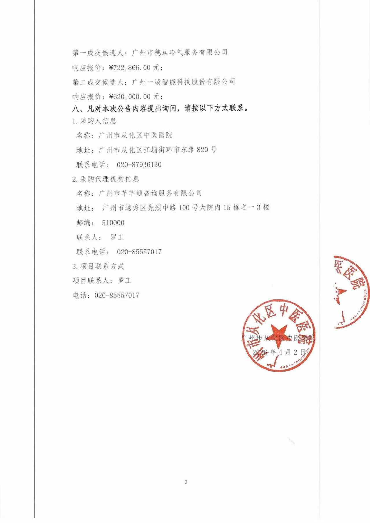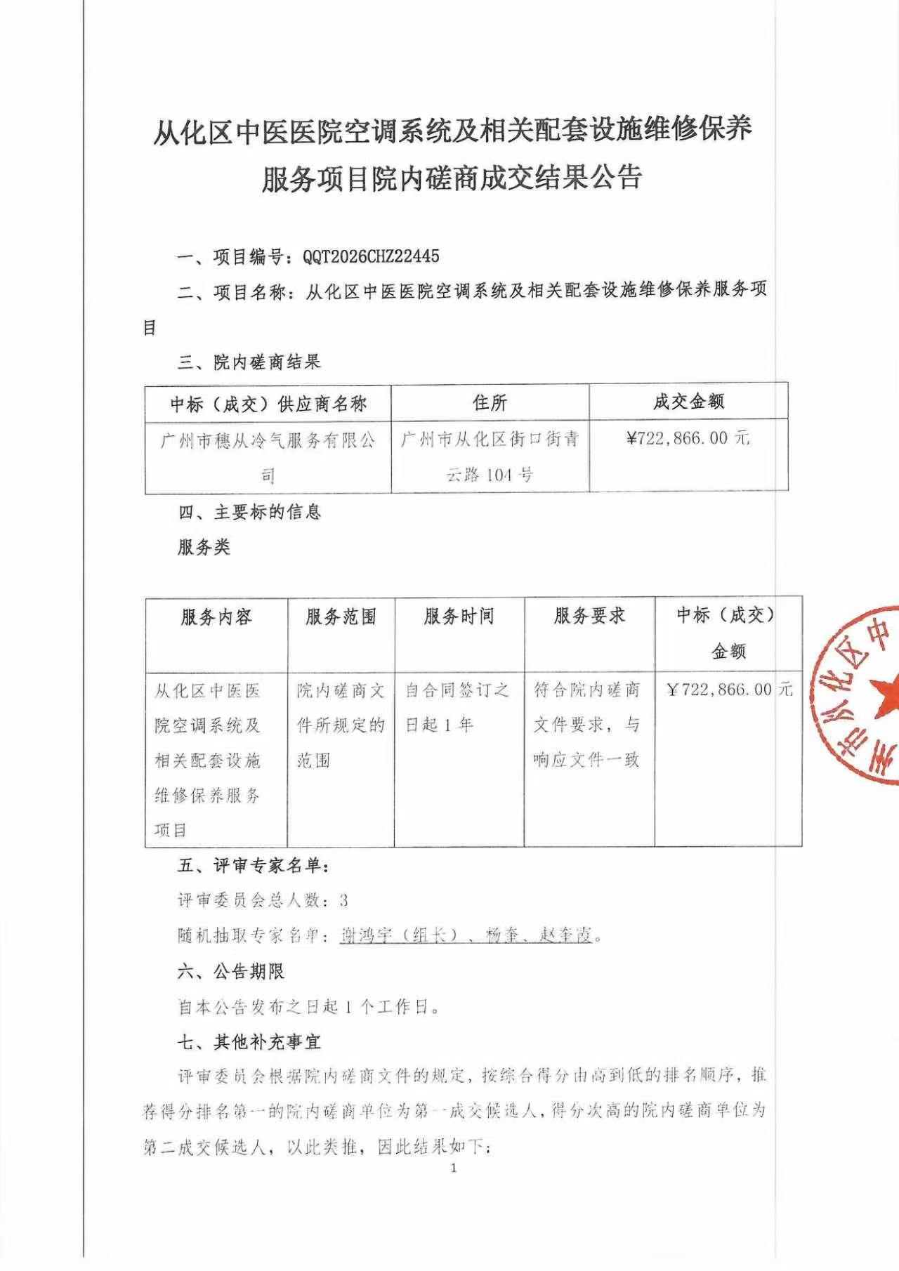 从化区中医医院空调系统及相关配套设施维修保养服务项目院内磋商成交结果公告